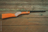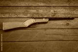 An old toy for playing hunter. A child's hunting rifle is lying on the wooden floor. Weapons for children. A toy double-barreled shotgun.