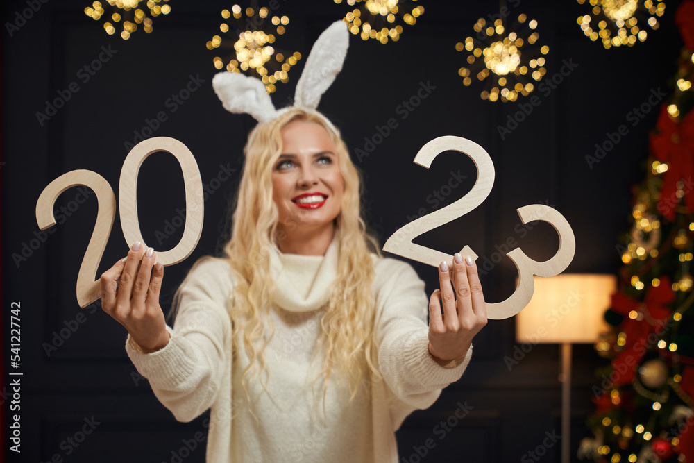 Front view of beautiful woman wearing knitted sweater, looking up, holding 2023 decoration, smiling. Attractive blonde girl with red lips standing, dreaming. Concept of new year and xmas.