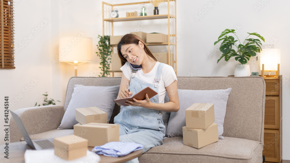 E-commerce businessman is talking on the phone with a customer who comes in to inquire and place her order, Woman writes mailbox address in preparation for delivery, SME entrepreneur, Packing box.