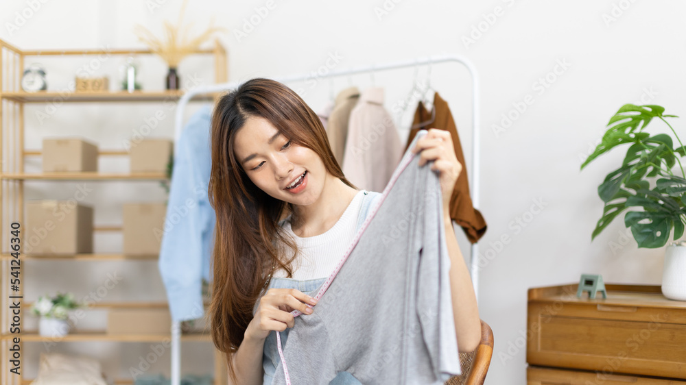 Beautiful woman with social media influences performing live or recording shows selling cheap fashion clothes in her studio, Recording vlog video live streaming, Online fashion clothing business.