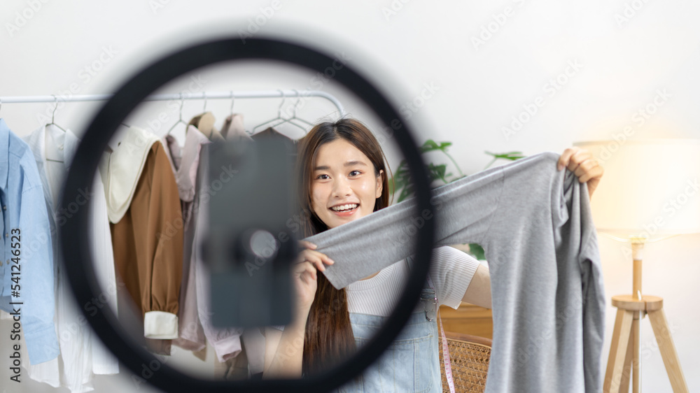Beautiful woman with social media influences performing live or recording shows selling cheap fashion clothes in her studio, Recording vlog video live streaming, Online fashion clothing business.