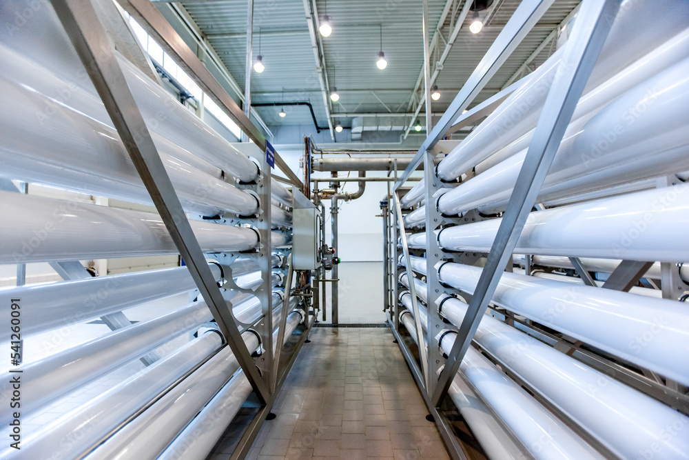Equipment on beverage factory. Industrial drink production