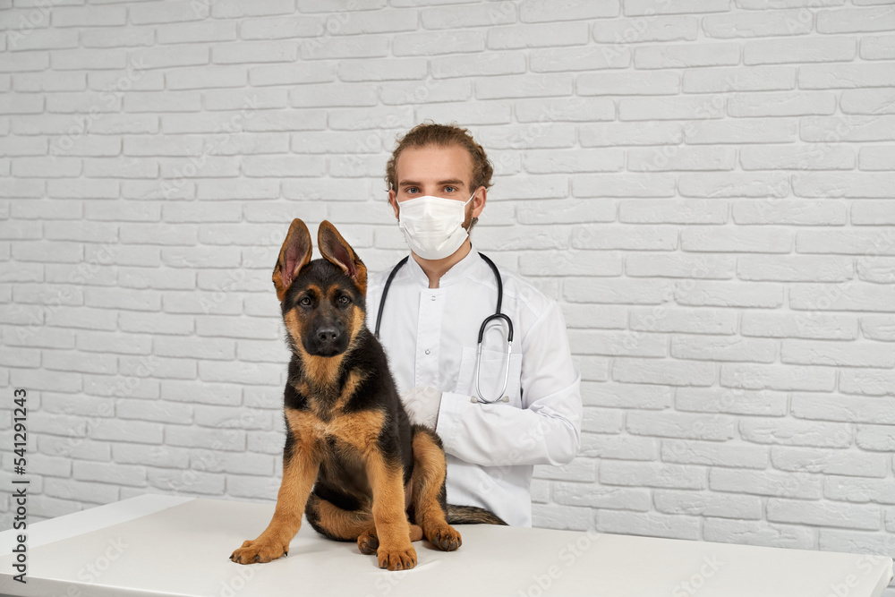 Portrait of good natured vet and his dog patient. Animal gratefully looking straight standing near livesaver. Veterinary finally healing and comforting sick animal. Concept of vet job.