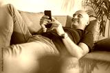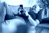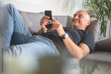 A handsome bald man is lying on the couch and reading something funny on his phone