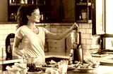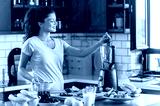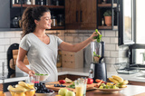 Beautiful young smiling pregnant woman in the kitchen cutting various healthy fruit and putting it in a blender to prepare a smoothie.
