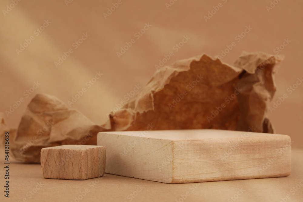 Wooden eco rustic platform podium on beige. Minimal empty display product presentation scene. Lght and shadow background.