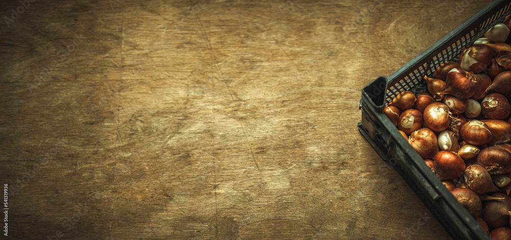 Orange garden onion bulbs in a plastic container.Fresh vegetables from your garden on a wooden background.Sale of vegetables.Round onions in a container.