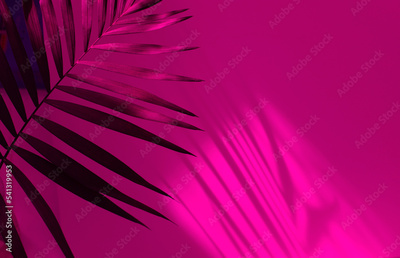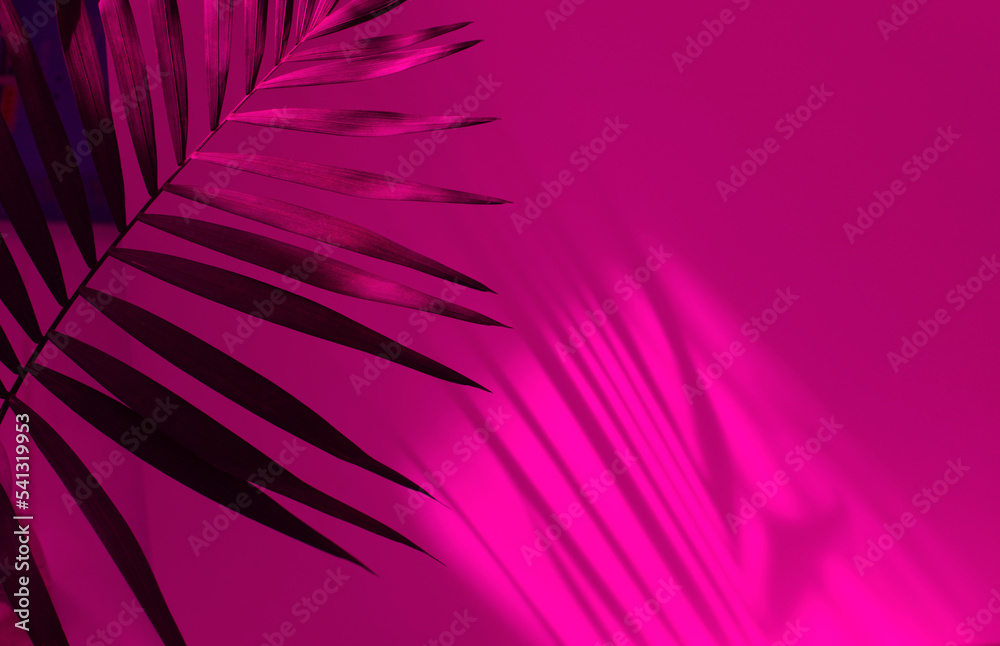 Palm leaf and Soft focus pink neon texture refraction wall . Light and shadow smoke abstract copy space background.