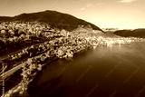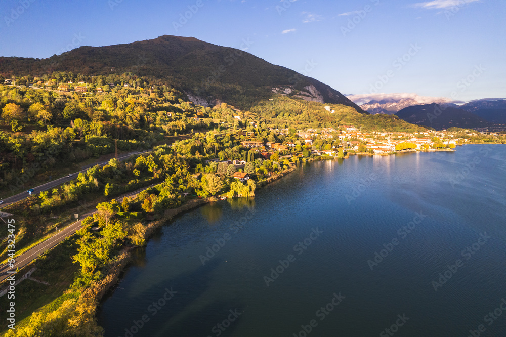 Aerial view of landscape of Pusiano lake in Brianza, Lombardy, Italy