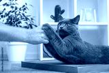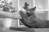 A grey cat is playing with a man's hand. The cat bites the man's hand. A playful grey cat. The grey cat protects his toy.