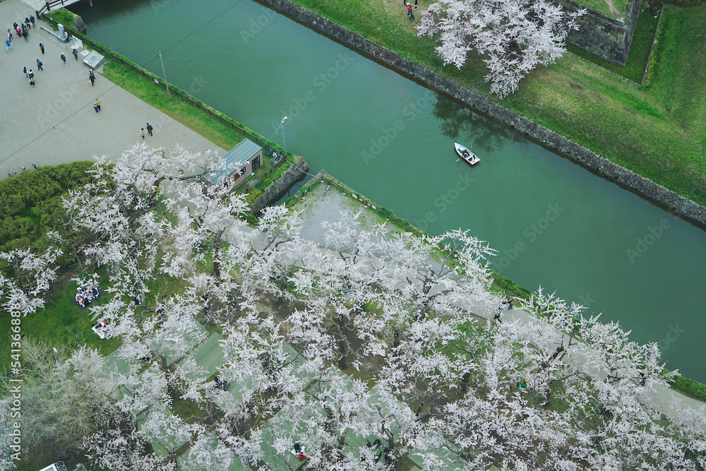 Aerial view of Sakura blooming and Service small boats in spring of Goryokaku park, Hakodate city, Japan.
