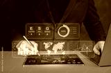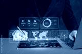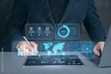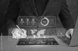 Digital Transformation. Businessman working at modern office. modern virtual interface. Man using modern tablet for business management according to esg principles