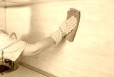 Cleaning service worker in yellow rubber protective cleaning and polish kitchen surface. cleaning kitchen wall from grease and soot