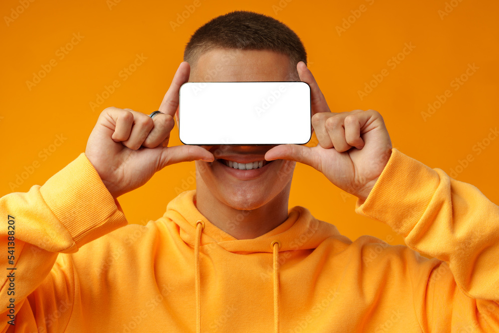 Smiling young man showing mobile phone blank white screen on yellow background