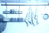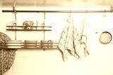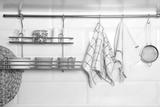 Different kitchen towels hanging on hook rod and shelves with ramekins indoors