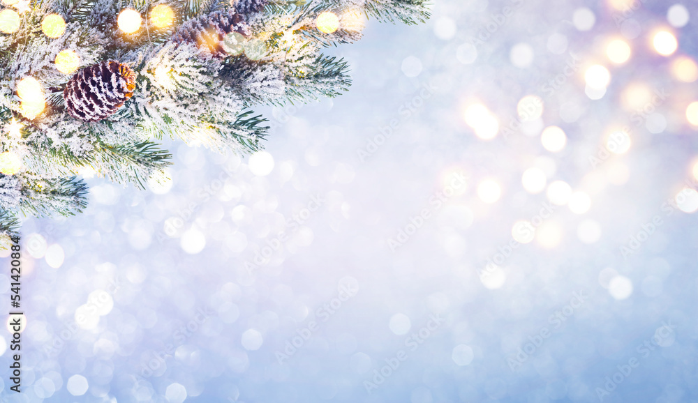Abstract frosty Christmas lights background with decorated fir tree branch