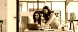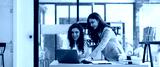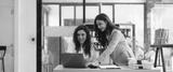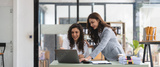 Two smart multiethnic business people working together with laptop while talking about job news in the office. Panoramic or Banner.