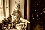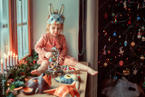 Cute little girl is dressing up a tiny Christmas tree and trying on New Year's animal masks. Image with selective focus and toning.