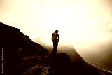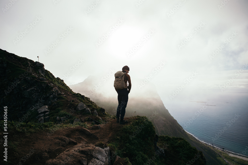 Hiker stand on top of mountain climb. Man in hiking outfit with backpack stand on top of hill overlooking epic mountain views covered by clouds. Hiking in Norway, Lofoten