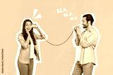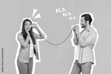 Composite collage of two excited people communicate connected cups isolated on painted yellow background