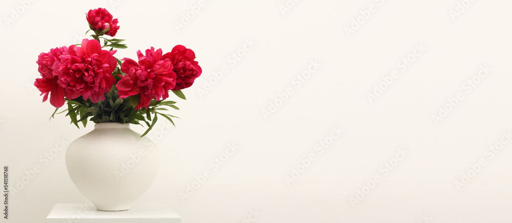 Purple pion flower bouquet in white vase on gray beige interior wall. Minimalist still life. Light and shadow nature background.