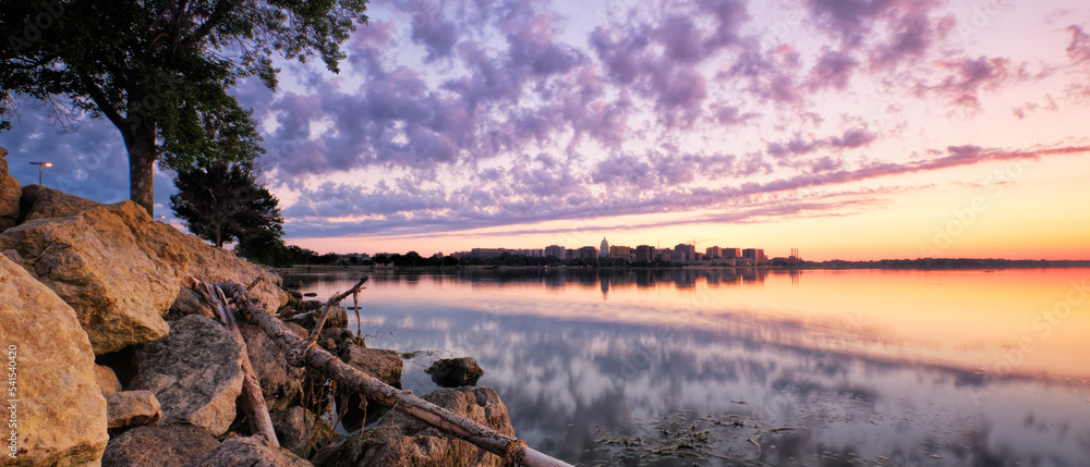 Sunrise reflecting in the water of Lake Monona, Madison, WI.
