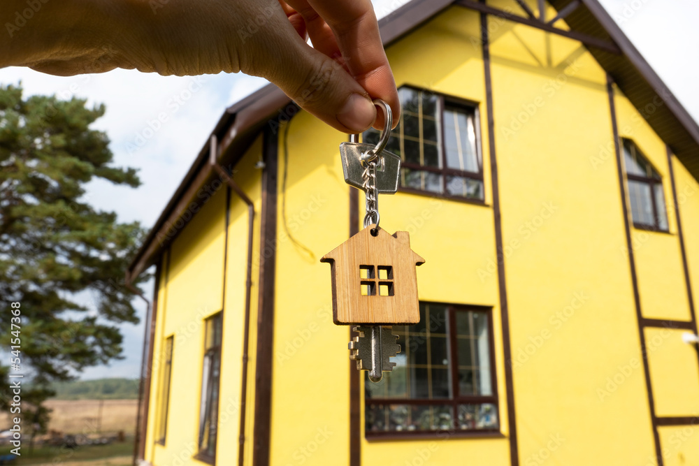A hand with the keys to a new house on the background of an unfinished cottage. Building, project, moving to a new home, mortgage, rent and purchase real estate. To open the door. Copy space