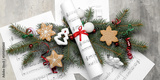 Note sheets with Christmas decor, fir branches and cookies on grunge background