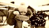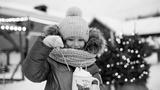 Girl with mug with snow, candy cane and inscription Merry and Bright in her hands outdoor in warm clothes in winter at festive market. Fairy lights garlands decorated snow town for new year. Christmas