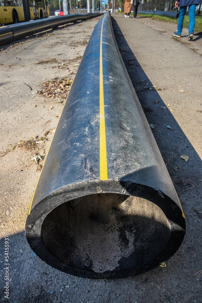 New water pipes after replacement near the old house. Pipeline. Replacement of the pipeline. New pipes on the road in the city.