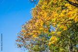 Beautiful yellow autumn maple leaves on trees in park against the blue sky. Golden autumn. Delicate golden leaves in autumn