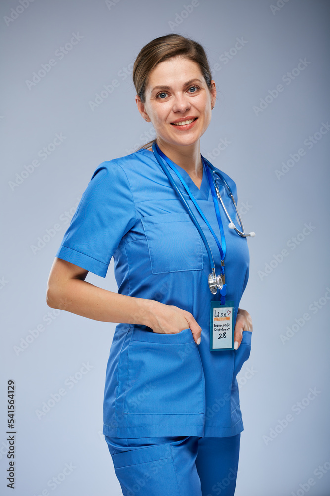 Smiling nurse woman with hands in pockets. Isolated female portrait.
