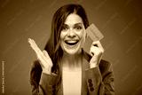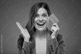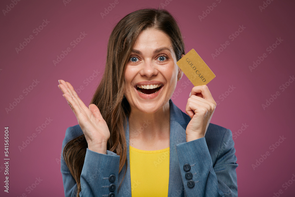 Laughing woman holding credit card. Close up face isolated advertising portrait on pink back.