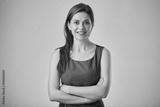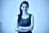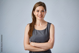 Smiling business person office worker in gray dress standing with arms crossed, isolated advertising portrait.