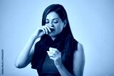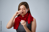 Sick business woman wearing red scarf using tissue for her nose, isolated advertising portrait.