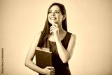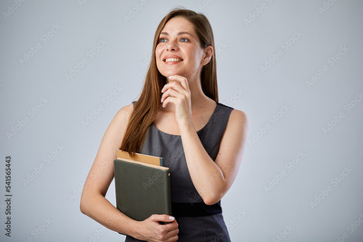 Thinking teacher or student woman holding book or workbook looking at side away. Isolated advertising portrait.