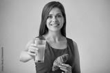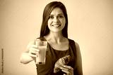 Smiling woman holding her lunch with orange juice and croissant. isolated advertising portrait.