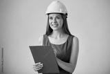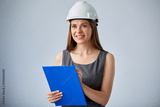 Woman engineer writes on tablet. Isolated female worker portrait.