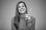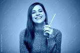 Happy woman in winter clothes holding orange juicy drink. Isolated female advertising portrait.