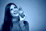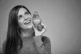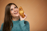 Young woman holding croissant looking up. Advertising female studio portrait.