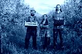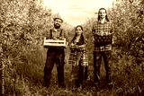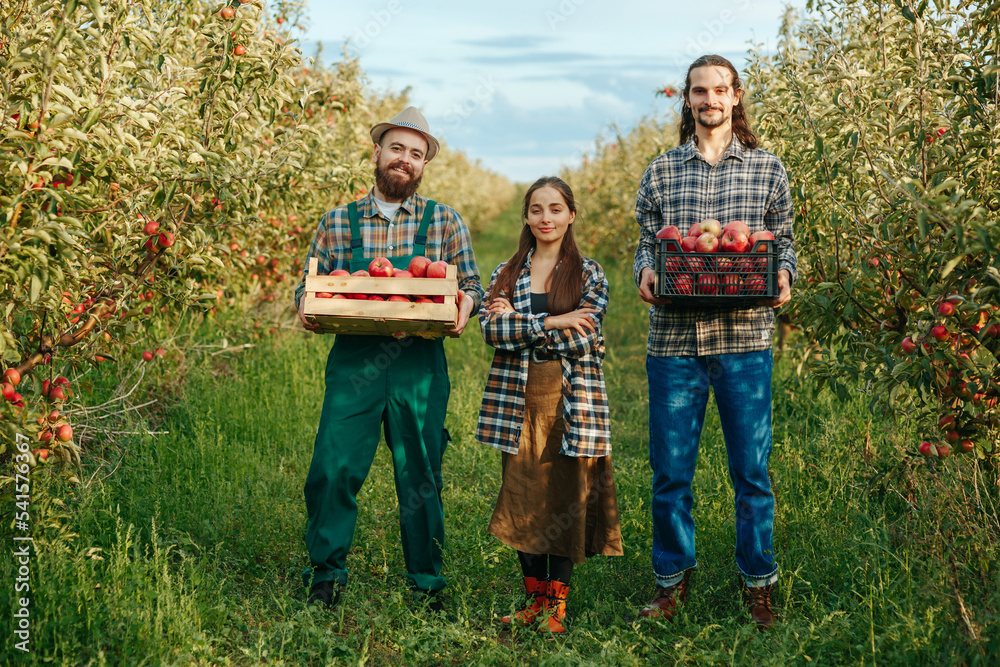 farming family looking at camera, three young people, two men and a woman in the apple orchard. men holding crates of apples, farmer with beard and hat,