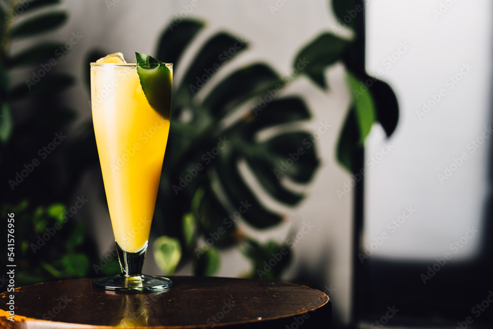 cocktail with brandy, passion fruit and mint, refreshing tropical drink