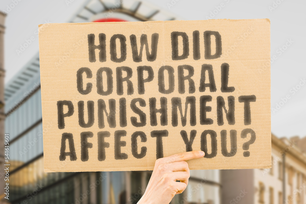 The question " How did corporal punishment affect you? " is on a banner in men's hands with blurred background. Hit. Measure. Method. Parent. Scared. Adult. Teaching. Violent. Stop. Social. Bad. Teen