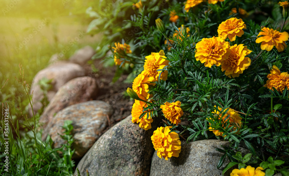 The marigold plant is small-flowered orange in color.Nursery of wild plants. Photo of bright yellow flowers in a flower bed in the park. Sale of flower seeds.