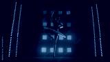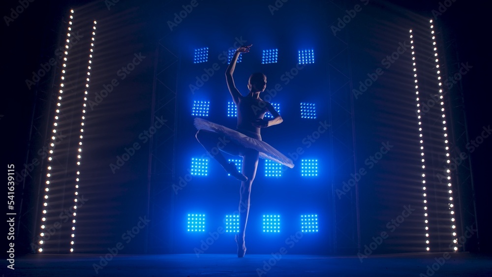 Young ballet dancer gracefully dancing against background of smoke and spotlights with soft blue light. Silhouette of a beautiful slim figure in white swan tutu and pointe shoes.