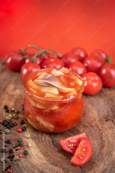 Herring in tomato sauce, in an open jar, on a wooden chopping board, on a red background. Composition with canned fish.