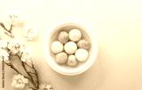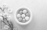 Tang Yuan(sweet dumplings balls), a traditional cuisine for Mid-autumn, Dongzhi (winter solstice ) and Chinese new year with plum flower on pastel background.