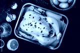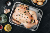 Chicken. Whole fresh raw free range chicken with spices on dark background, ready to cook, top view