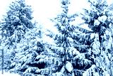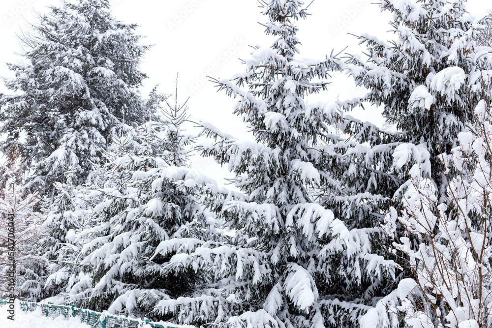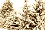 Winter. Snow-covered trees against the snowy sky