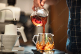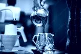 Barista making a Geisha coffee, pouring hot water from kettle over a ground coffee powder